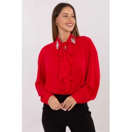 Výjimečná elegantní blůza vytvořená s ohledem na návštěvní příležitosti, práci a večírky. Její hladký vzor dodává celku třídu a decentní eleganci, díky čemuž se skvěle hodí jak do formálních, tak do více večerních stylizací. Model je vyroben z lehkého, příjemného polyesteru, který krásně padne na postavu. Dlouhá délka s charakteristickým delším zadkem než vpředu dává blůze moderní a velmi ženský charakter. Blůza ohromuje detaily, široký límec s ozdobami a decentní žabot podtrhuje její elegantní styl. Bouffantové rukávy dodávají lehkost a moderní, výrazný tvar, vytvářejíce efektní, ale stále velmi harmonický celek. Bez zapínání je blůza pohodlná a snadno se obléká. Ideální model pro ženy, které ocení eleganci, pohodlí a neobvyklé detaily ve svých každodenních i výjimečných stylizacích.