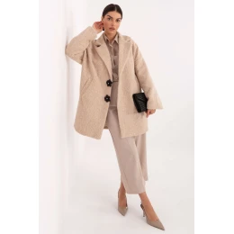 Tento elegantní, přechodný dámský kabát je stylovým návrhem pro podzimní, zimní a jarní sezónu. Vyrobený z polyesterové látky s různorodou fakturou, vyniká moderním vzhledem a pečlivým provedením. Model po kolena má dlouhý rukáv a klasické zapínání na knoflíky, co zdůrazňuje jeho nadčasový charakter. Kabát je vybaven pohodlnou podšívkou pro zajištění pohodlí nošení a kapsy na zip mu dodávají funkčnost. Odnímatelné brože jsou decentním ozdobným prvkem, díky kterému získává stylizace výjimečný ženský charakter. Jedná se o univerzální model, který se hodí jak na každý den, tak i do práce nebo na slavnostní příležitosti.