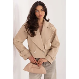Krátký dámský trenčkot je klasický přechodný kabát v casual stylu, který se skvěle hodí jak do práce, tak na běžné nošení. Vyrobený z polyesteru působí elegantně a je praktický v používání, díky hladké fakturze zůstává nadčasový a univerzální. Model s krátkou délkou je vybaven dlouhým rukávem, širokými límci a nárameníky, které mu dodávají charakteristický vzhled trenčkotu. Dvojitý řadový knoflíkový závěs zdůrazňuje klasický střih, a podšívka zvyšuje pohodlí nošení a pečlivost provedení. Jedná se o lehký kabát bez podšívky, ideální na podzim, zimu, jaro. Skvěle doplní každodenní stylizace, dodávajíc jim eleganci a městský šarm.