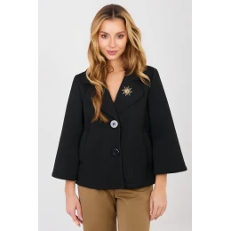 Elegantní dámský přechodný kabát vyrobený z moderního pěnového materiálu je stylovou volbou na podzim, zimu a jaro. Vyrobený z vysoce kvalitní směsi polyesteru a elastanu poskytuje pohodlí nošení, lehkost a estetické přizpůsobení postavě. Model s krátkou délkou a hladkým vzorem se skvěle hodí jak do každodenních outfitů, tak i do práce. Rukáv délky 3/4 dodává kabátu jemnou eleganci a lehkost. Jednořadé zapínání na knoflíky zdůrazňuje klasický charakter střihu. Kabát nemá žádné podšívky ani vycpávky, což ho činí ideálním přechodným krytím. Praktické kapsy zvyšují funkčnost a ozdobná brož dodává elegantní akcent, který dokresluje celkový outfit.
