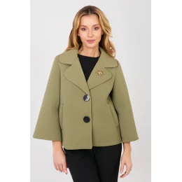 Elegantní dámský přechodný kabát vyrobený z moderního pěnového materiálu je stylovou nabídkou na podzim, zimu a jaro. Vyrobený z vysoce kvalitní kombinace polyesteru a elastanu poskytuje pohodlí nošení, lehkost a estetické přizpůsobení postavě. Model s krátkou délkou a hladkým vzorem se skvěle hodí jak do každodenních stylizací, tak do práce. Rukáv délky 3/4 dodává kabátu jemnou eleganci a lehkost. Jednoradé zapínání na knoflíky zdůrazňuje klasický charakter střihu. Kabát nemá žádné podšívky ani výplně, díky čemuž se skvěle hodí jako přechodový kousek. Praktické kapsy zvyšují funkčnost a ozdobná brož dodává eleganci, která doplňuje celkový vzhled.