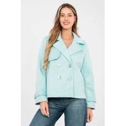 Zamszový přechodný dámský kabát je stylovým návrhem v casualovém provedení, ideální pro každodenní nošení. Skvěle se hodí do podzimní, zimní a jarní sezóny jako lehká vrchní vrstva, která podtrhuje charakter každého outfitu. Model s krátkou délkou je vyroben z příjemného materiálu na bázi polyesteru s přídavkem elastanu. Hladká struktura dodává elegantní jednoduchost, zatímco jemně elastická látka zajišťuje pohodlné nošení a volnost pohybu. Kabát nemá žádnou výplň, což ho činí ideálním pro přechodné období. Dvouřadé zapínání na knoflíky zdůrazňuje klasický střih, a límec s límci dodává celkovému vzhledu eleganci. Dlouhý rukáv zdobený páskem s knoflíkem je decentní, stylový detail. Praktické kapsy zvyšují funkčnost modelu. Jedná se o univerzální kabát, který se snadno sladí jak s džíny a kotníkovými botami, tak s elegančnějšími, každodenními outfity.