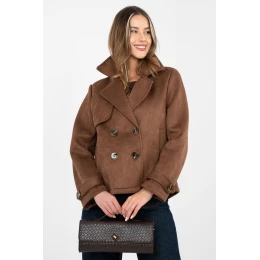 Zamszový přechodný dámský kabát je stylová nabídka v casualovém provedení, ideální na každý den. Skvěle se hodí na podzim, zimu a jaro jako lehká vrchní vrstva, která podtrhuje charakter každého outfitu. Model s krátkou délkou je vyroben z příjemného materiálu z polyesteru s přídavkem elastanu. Hladká struktura mu dodává elegantní jednoduchost a jemně elastická látka zajistí pohodlí nošení a volnost pohybů. Kabát nemá žádné podšívání ani výplň, díky čemuž se skvěle hodí do přechodných období. Dvojitý řadový zapínání na knoflíky zdůrazňuje klasický střih, a límec s odstávajícími límci dodává celku eleganci. Dlouhý rukáv ozdobený páskem s knoflíkem je decentní, stylový detail. Praktické kapsy se zvyšující funkcionalitou modelu. Jedná se o univerzální kabát, který si snadno sladíte jak s džíny a černými botami, tak i s elegantnějšími, každodenními kombinacemi.