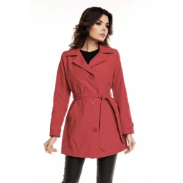 Klasický dámský trenčkot s bavlněnou podšívkou, ideální pro podzimní rozmary počasí. Kabát je v pase sešněrovaný a zapíná se na tři velké knoflíky. Manžeta zdobená proužkem. Polyesterová podšívka.