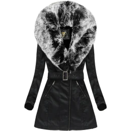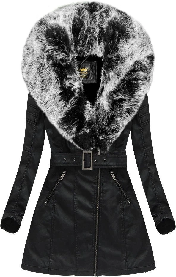 Černo-šedý kabát z ekologické kůže s kožešinovým límcem Libland (LD-5518)