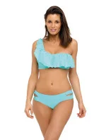 Součástí kompletu je podprsenka zavazovaná na zádech, která imituje top na jedno ramínko. Výstřih s velkým, vzdušným volánkem, vyrobený z lehké italské látky, vypadá fenomenálně. Krásné, sváteční barvy. Podprsenka je bez kostic, má tvarované, na vnitřní straně skryté vsadky modelující a zpevňující prsa, díky kterým poprsí vypadá atraktivně. Vsadky lze z modelu vyjmout, čímž vznikne "měkká" verze podprsenky. Kalhotky ve velmi dobré výšce, jsou velmi pohodlné a na bocích je zdobí svůdné prasklinky. Složení: 80 % polyamid, 20 % elastan.