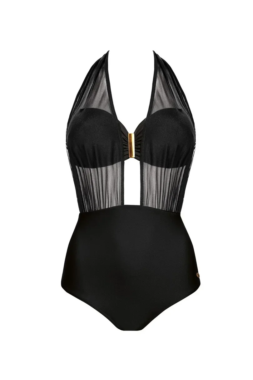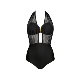 Niezwykle elegancki jednoczęściowy kostium kąpielowy z lini SECRET. Wykonany został z wysokogatunkowej, połyskującej mikrofibry z dodatkiem lycry. Biustonosz usztywniany, typu bardotka, z fiszbinami i wkładkami push-up na łączeniu misek klamra. Zapinany jest na plecach, ramiączka z regulacją, odpinane. Dół kostiumu gładki, z doszytym tiulem, zakładanym na miseczki i wiązanym na szyi