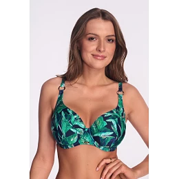 Plavková podprsenka s vyztuženými košíčky SK 235 Leafine od společnosti AVA Swimwear je dokonalou kombinací módního stylu a bezkonkurenčního pohodlí. Tropický potisk v odstínech svěží zelené na tmavě modrém pozadí nejen upoutá pozornost, ale také dokonale zvýrazní opálenou pokožku a dodá lehkou a svěží siluetu. Vyztužené košíčky s kosticemi jsou navrženy tak, aby poskytovaly plnou oporu a nadnášení - bez ohledu na velikost poprsí. Nastavitelná ramínka zdobená zlatými detaily a pevné zapínání na zádech zajišťují stabilitu a elegantní vzhled. Podprsenka SK 235 je ideální volbou na pláž i k bazénu - pro ženy, které ocení pohodlí a styl v každé situaci
