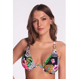 Plavková podprsenka SK 239 Royal Wild značky AVA Swimwear je kombinací odvážného designu a ženské jemnosti. Měkké měkké košíčky usazené na tvarovaném drátěném výlisku zajišťují přirozený tvar poprsí a zároveň ho jemně tvarují a zvedají. Nízký zaoblený můstek prsa zvedá a opticky přibližuje, čímž vytváří atraktivní dekolt bez push-up efektu. Na zádech tvoří ramínka nápadný kříž, který rovnoměrně rozkládá váhu a zvyšuje pohodlí při nošení, zatímco zavazování umožňuje dokonalé přizpůsobení. Intenzivní potisk kombinuje exotické květiny, listy a geometrické vzory a krásně zvýrazní vaše letní opálení. Zlaté detaily dodávají luxusní nádech. Tento model je ideální na léto - pro ženy, které rády kombinují módu, funkčnost a smyslnost.