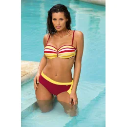 Podprsenka má vodorovný střih a funguje jako bardotka, zvedá a vypíná prsa a zároveň je opticky zvětšuje. Konstrukce je vyztužená pěnou, s podvazky a zabudovaným push-upem (push-up je v každé velikosti). Podprsenka je ideální i na opalování, její ramínka jsou zcela odepínací. Kalhotky s ozdobným zavazováním na boku, hladké, vás na pláži rozhodně nebudou omezovat. Složení: 80 % polyamid, 20 % elastan.