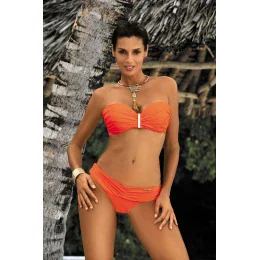 Senzační a jedny z nejhezčích plavek. Senzační podprsenka bardotka s vyztuženými košíčky, podšitím a kapsičkami na přiložené push-up košíčky (k dostání od velikosti S do XL včetně) dobře pozvedne prsa, vytvaruje je a sexy zvětší. Budete nadšená! Uprostřed podprsenky je elegantní brož ve zlaté barvě. Nastavitelná ramínka, která lze z modelu zcela odepnout, jsou ideální na opalování. Kalhotky velmi pěkně sedí na bocích, v horní části jsou mírně nařasené a dobře leží na postavě. Celý komplet je vyroben z krásné italské látky a zvýrazněn fenomenálními, svátečními barvami. Dokonalá volba!