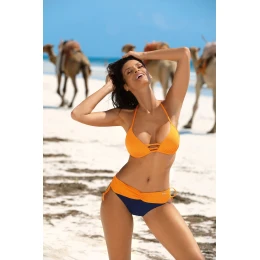 Podprsenka s košíčky vyztuženými jemnou pěnou, s push-upkou umístěnou trvale v modelu (nelze vyjmout), pěkně shrnuje prsa, přibližuje je k sobě a opticky je zvětšuje, čímž zároveň vytváří hluboký, smyslný dekolt. Ramínka uprostřed tento sexy dojem umocňují. Push-upka je přítomna v každé velikosti modelu. Podprsenka se zavazuje za krkem i na zádech. Součástí kompletu jsou kalhotky s ozdobným zavazováním na bocích, vkládané tradičně (zavazování je ozdobným prvkem). Elegantní barvy, které dokonale ladí s letním klimatem.