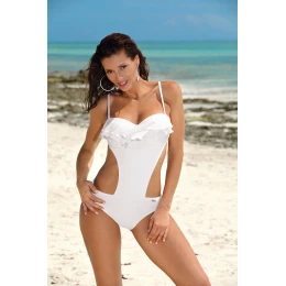 Jedná se o jednodílné plavky ve stylu monokini s vykrojenými boky, které jim dodávají moderní nádech. Vrchní díl plavek tvoří sexy push-up a přesně tvarované košíčky, vyztužené speciální pěnou, se zabudovanou a neodnímatelnou push-up výplní (push-up je v každé velikosti plavek). Střih pozvedá a zvětšuje prsa, vytváří sexy dekolt, zdobený éterickým volánkem. A to není vše. Plavky jsou vyrobeny z italské elastické látky, jsou hladké, pohodlné, zavazují se na zádech a mají zcela odepínací ramínka. Šťavnaté barvy na výběr ve více než deseti variantách - vyberte si je ve své oblíbené barvě. Složení: 80 % polyamid, 20 % elastan.