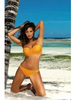 Jedny z nejkrásnějších a nejlepších plavek letošního léta. Velmi elegantní a mimořádně ženské. Podprsenka s vyztuženými košíčky, kosticemi a push up výplní, kterou lze v případě potřeby vyjmout. Dokonale pozvedne prsa, vymodeluje je, zvětší... Brož ve zlaté barvě umístěná uprostřed vypadá obzvlášť pěkně. Ramínka jsou nastavitelná, odepínací. V pase se pohodlně zapínají na přezku. Spodní díl se štíhlými boky, opticky prodlužuje nohy. Velmi ženské a pohodlné.