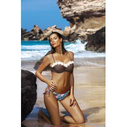 Propozycja dla pań, które marzą o dużych, jędrnych, seksownych piersiach, pięknie zebranych w dekolcie. Biustonosz wyróżnia się wspaniałą konstrukcją, przewidzianą na mniejsze i średnie piersi - jest usztywniany i posiada dość duże wypełnienie push up, umieszczone na stałe w biustonoszu. Umożliwia spektakularne wypchnięcie piersi ku górze, ich wymodelowanie i optyczne powiększenie, co zresztą widać na zdjęciu. Zastosowanie kwiecistej, delikatnej lamówki u góry, dodatkowo zwraca uwagę na pięknie wymodelowany dekolt. Ramiączka o regulowanej długości, odpinane, idealne sprawdzą się podczas opalania. Obwód wiązany na plecach. Figi to wzorzyste, wiązane po bokach brazyliany. Dla uzyskania pełnego efektu należy je mocno pociągnąć ku górze, aby ich trójkątny kształt ładnie ozdobił pupę, która częściowo wysuwa się poza kontur fig.