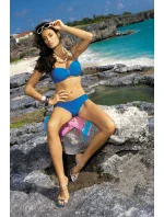 Luxusní plavky v krásné královské modré barvě, s nastavitelnými a odepínacími ramínky (umožňujícími rovnoměrné opálení těla), zdobené třpytivými zirkony. Opravdový šmrnc, kterého si na pláži jistě všimnete... Jeden z nejlepších návrhů této sezony. Podprsenka má balkonetový střih (bardotka), který dokonale zvýrazní krásu ženského těla. Vyztužené košíčky s kosticemi účinně pozvednou prsa a výmluvně je zvýrazní. V soupravě (od velikosti S do XL) jsou navíc (vyjímatelné) push-up košíčky, které, pokud jsou ponechány v modelu, sexy zvětší prsa. Podprsenka se zapíná vzadu na přezku.