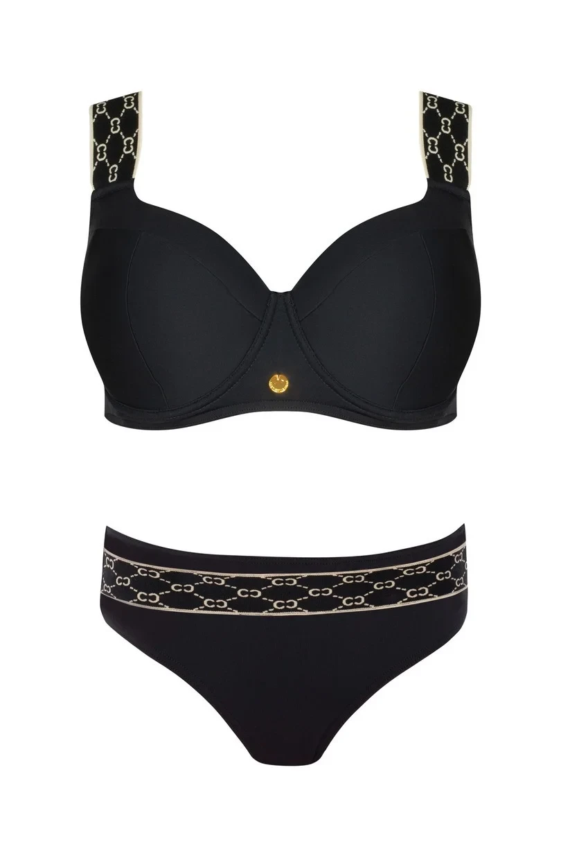 Postaw na luksusowy minimalizm i doskonałe dopasowanie z kostiumem kąpielowym GRENADA 2 S995V1GN2 od marki SELF. Model full cup z usztywnianymi miseczkami i fiszbinami to idealny wybór dla kobiet poszukujących pełnego wsparcia i eleganckiego wyglądu na plaży czy basenie. Czarna tkanina z kontrastowym, beżowym motywem łańcuchów na ramiączkach i pasie majtek dodaje całości ekskluzywnego charakteru. Regulowane ramiączka umożliwiają dopasowanie do sylwetki, a wygodne figi z ozdobnym pasem zapewniają komfort i klasyczny styl. To model, który łączy ponadczasową elegancję z nowoczesnym detalem.