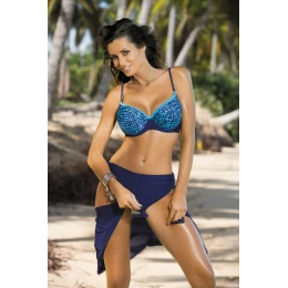 Tyto dvoudílné plavky jsou určeny pro ženy s velkými, plnými ňadry. podprsenka je vyztužená pěnou, prsa nezvětšuje, ale přibližuje je k sobě a pěkně tvaruje. košíčky jsou hluboké a dobře stavěné, sbírají a podporují poprsí. podprsenka má podšití, zapíná se na přezku. Vzorovaná látka dodává charakter. ramínka jsou nastavitelná. součástí soupravy jsou plnější kalhotky s praktickým zavazováním na bocích, díky kterému je lze snadno změnit na šortky nebo klasické kalhotky. jsou z hladké látky, neprosvítají. modelují bříško a hýždě.