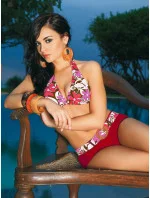 Pohodlné dvoudílné plavky jsou vyrobeny z kvalitní italské měkké tkaniny a zdobeny malebnými květy. Podprsenka ve stylu bikin má vyztužené košíčky, které lze vyjmout a vytvořit tak měkkou strukturu košíčků. Podprsenka krásně a přirozeně zvýrazňuje tvar prsou, smyslně je zaobluje a jemně odhaluje. V pase a na ramínkách se zavazuje. Šortky jsou hladké s ozdobným páskem. 80 % polyamid, 20 % elastan.