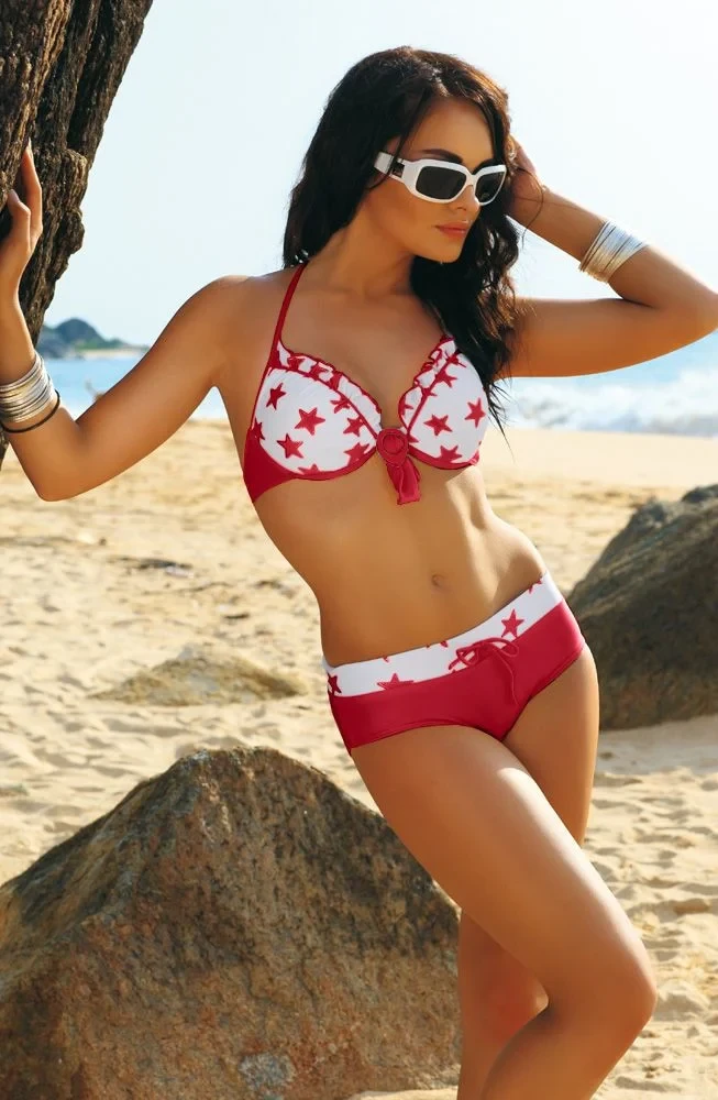 Pokud chcete mít na pláži pohodlí, zvolte plavky s push-up podprsenkou a šortkami! Jedná se o duo, díky kterému budete na pláži vypadat sexy a zároveň pohodlně. Podprsenku zdobí jemný, lehce třpytivý vzor a uprostřed bižuterní ozdoba. Její bílý podklad dokonale zvýrazní vaše opálení. Výstřih je lemován jemným lemováním. Konstrukce je vyztužená, součástí jsou push-up vycpávky s kosticemi (lze je z podprsenky vyjmout). Šortky jsou skvělou alternativou tradičního spodního dílu. Složení: 80 % polyamid, 20 % elastan.