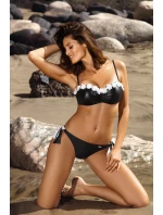 Biustonosz z kwiecistą lamówką przy dekolcie, wygląda romantycznie i sexy. Każdy kwiatuszek posiada mały, perłowy koralik umieszczony po środku. Fason jak przystało na producenta zakochanego w mega kobiecym Looku - daje z siebie wszystko, abyś na plaży wyglądała pięknie. Miseczki usztywniane, z fiszbinami i dużym wypełnieniem push up, umieszczonym na stałe w modelu. Świetnie unosi, modeluje i optycznie powiększa piersi. Konstrukcja przewidziana na małe i średnie biusty. Push up bez możliwości wyjęcia, dostępny w rozmiarach S, M, L, XL, XXL. Obwód wiązany na plecach. Ramiączka z możliwością odpięcia, o regulowanej długości. Figi o kroju brazylijskim, seksownie zdobią biodra. Aby uzyskać zamierzony efekt należy je mocno pociągnąć ku górze bioder. Boki wiązane po obu stronach.