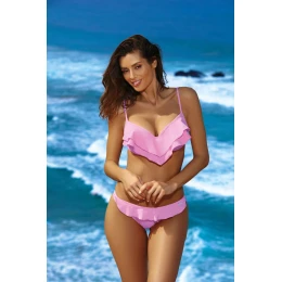 Ten strój obdarzy Cię wyjątkowym wdziękiem (i do tego pozwoli zapomnieć o ewentualnych kompleksach). Ma świetny fason. Został stworzony na małe i średnie biusty - dobrze zbiera, modeluje i unosi piersi, znacząco je powiększając. Dekolt nabiera gracji, seksapealu, a Ty maksimum kobiecości. Jego sekret? - to miseczki usztywniane delikatną pianką, z fiszbinami i dość dużym wypełnieniem push up, które tym razem umieszczono na stałe wewnątrz biustonosza. Falbana na dekolcie to jeden z najbardziej topowych trendów lata. Ramiączka o regulowanej długości, obwód wiązany na plecach. Do tego zalotne figi, typu biodrówki, również z falbaną. Kostium uszyto z pięknej, włoskiej tkaniny Carvico Fabrics, a dostępny jest w wielu atrakcyjnych, plażowych kolorach. Wybierz go w swoim ulubionym!