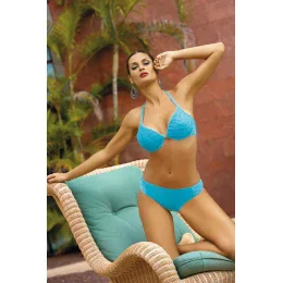 Esence šťavnaté barvy plus jemné hrášky... Miranda je ideální volbou na pláž. Hladké, vyztužené košíčky s kosticemi, zvýrazněné vzorovaným lemováním. Jemné řasení dodává koketnost. Struktura příjemně shrnuje a přibližuje prsa k sobě. Velikosti S, M, L mají navíc (vyjímatelnou) push-up výplň, která ponechaná v podprsence sexy zvětšuje velikost prsou. Podprsenka se pohodlně zavazuje za krkem i na zádech.