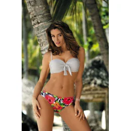 Výjimečné dvoudílné plavky v krásných barvách. Podprsenka má vyztužené košíčky s push up výplní (k dostání ve velikostech S, M, L, XL) - výplň lze z modelu vyjmout. Podprsenka dokonale shrnuje prsa do výstřihu a silně je zvedá. Push up zvedá prsa o celou velikost. Půvabné "zavazování" uprostřed modelu působí dojmem. Ramínka jsou odepínací. Pas se zapíná na přezku. Kalhotky jsou velmi pohodlné, s krásnými květy. Celek působí velmi žensky. Vřele doporučujeme. Italská, velmi kvalitní látka Carvico Tesutti.