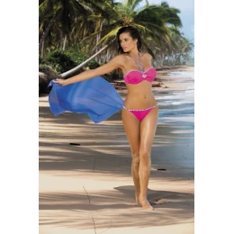 Kostium kąpielowy w marynarskim stylu to hit każdego lata! Oryginalne kolory pięknie współgrają z opalenizną. Biustonosz typu bardotka posiada usztywnione miseczki, wzmocnione fiszbiną dolną oraz boczną. Bardzo dobrze zbiera piersi, przybliża je ku sobie oraz modeluje.Dodatkowo do rozmiarów: S, M, L dodawane są wyjmowane poduszeczki push up, które optycznie powiększają biust. Biustonosz gładki, ozdobiony w górnej części prążkowaną lamówką. Pośrodku miseczek umieszczono broszkę, imitującą marynarski ster i kotwicę. Całość ozdobiona połyskującymi diamencikami. Broszka zapinana jest na agrafkę, w razie potrzeby można ją swobodnie odpiąć.Biustonosz zapinany jest na klamerkę, dodatkowo można go przewiązać na szyi lub wyciągnąć. W zestawie mocniej wykrojone majteczki, z cienkimi paseczkami na biodrach – paski można dowolnie regulować. Gładkie, nie prześwitujące, elastyczne. Prążkowana lamówka dodaje całości uroku.