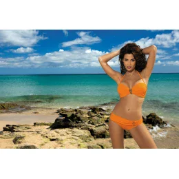 Jedny z nejkrásnějších plavek letošního léta! Sexy střih, módní barva jsou největšími přednostmi těchto plavek. Balkonová podprsenka, zdobená efektní zlatou broží, která dokonale ladí s opálením. Podprsenka dokonale tvaruje prsa, dodává jim svůdný tvar. Má kostice - díky nim je poprsí nadnášeno a podepřeno. Má jedno, odepínací ramínko, které se dává za krk. Pro velikosti S, M, L, XL jsou přidány push up vycpávky (lze je vyjmout). Podprsenka se vzadu zavazuje, takže si každá žena může velikost upravit podle svých představ.