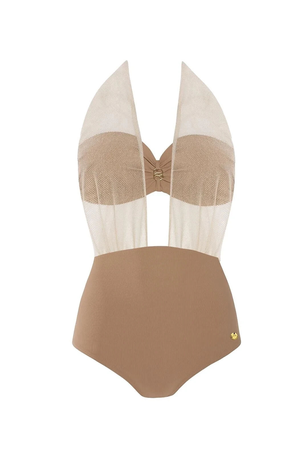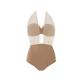 - mírně lesklý tyl pod linií prsou, překrývající košíčky a zapínání za krkem