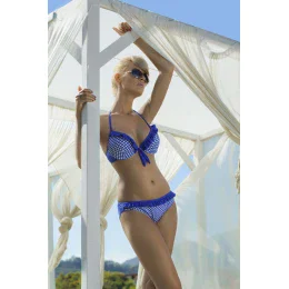 Puntíky jsou jedním z nejlepších motivů na pláž. Pokud i vy chcete zdůraznit - věnujte pozornost těmto plavkám. Zde je krásná, koketní, velmi ženská kompozice - směs puntíků, prázdninové barvy a jemného, mini volánku. Podprsenka má velmi dobrou konstrukci, zaměřuje se především na shrnutí prsou z boků, jejich přiblížení k sobě, nadzvednutí a dodatečné optické zvětšení. Vytváří atraktivní linii dekoltu. Model má (vyjímatelné) push-up vycpávky. Zavazuje se na zádech a za krkem. Tvarově střižené kalhotky, dokonale sladěné s podprsenkou, jsou vzadu hladké. Složení: 82 % polyamid, 18 % elastan.