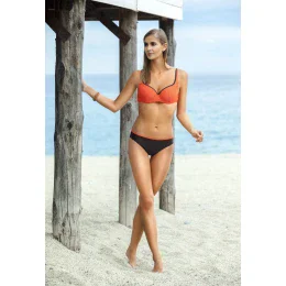 Pohodlné dvoudílné plavky v čokoládově oranžové barvě, s vyztuženou podprsenkou a push-up košíčky, sportovní styl, tvarovaný horní díl, pěkný tvar, příjemný tvar pro pozvednutí a zvýraznění prsou, mini tečky na košíčcích, nastavitelná ramínka, zapínání. Hladký, mírně vyšší spodní díl se vzorovaným lemováním je velmi pohodlný. 82 % polyamid, 18 % elastan.