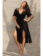 Působivá černo-zlatá dlouhá tunika, která obepíná tělo jako mlha. Fenomenální dlouhá tunika převázaná mašlí. Vyrobeno z mírně průhledné, průsvitné italské tkaniny. Model s krátkými rukávy. Ramena a záda jsou zakončena krajkou v barvě starého zlata. Tunika má také dodatečné vázání skryté na vnitřní straně tuniky, díky němuž celý střih působí smyslně, luxusně a sexy. K dispozici v mnoha krásných plážových barvách.
