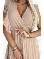 Emily - plisované šifonové šaty s výstřihem a volánky na ramenou. Sukně byla ušita v módní délce 7/8. Zapínání na zádech na krytý zip. barva: béžová. značka numoco. polská výroba.