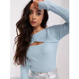Světle modrý žebrovaný klasický svetr.