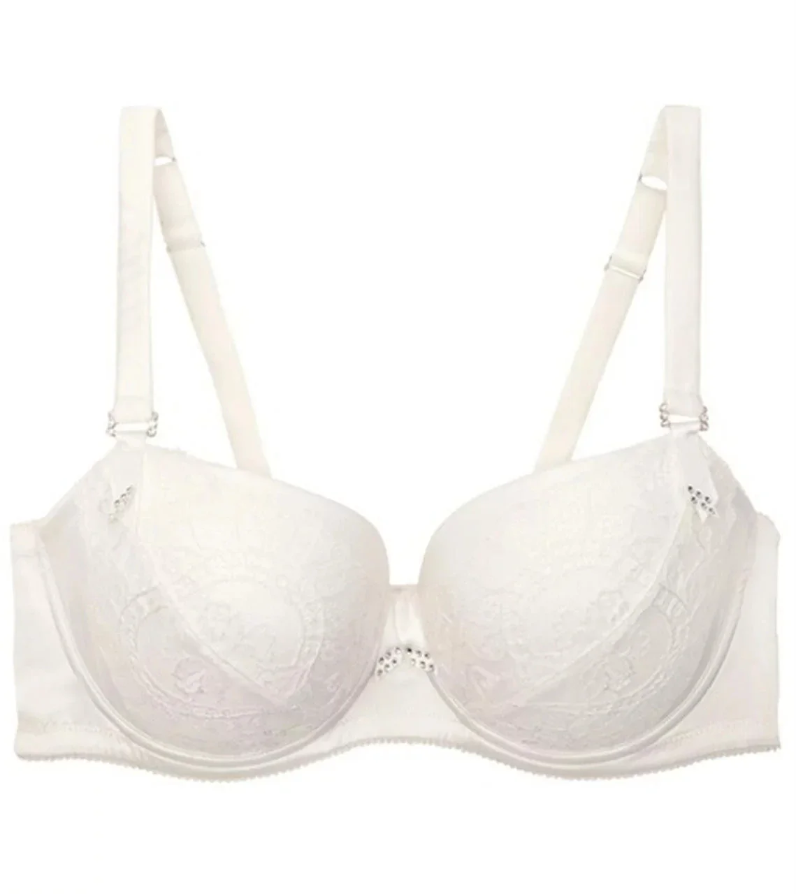 Balkonova podprsenka z elastického saténu, na košíčcích s jemnou krajkou. Posuvná saténova ramínka jsou ke košíčkům přichycena ozdobným kamínkovým čtverečkem.