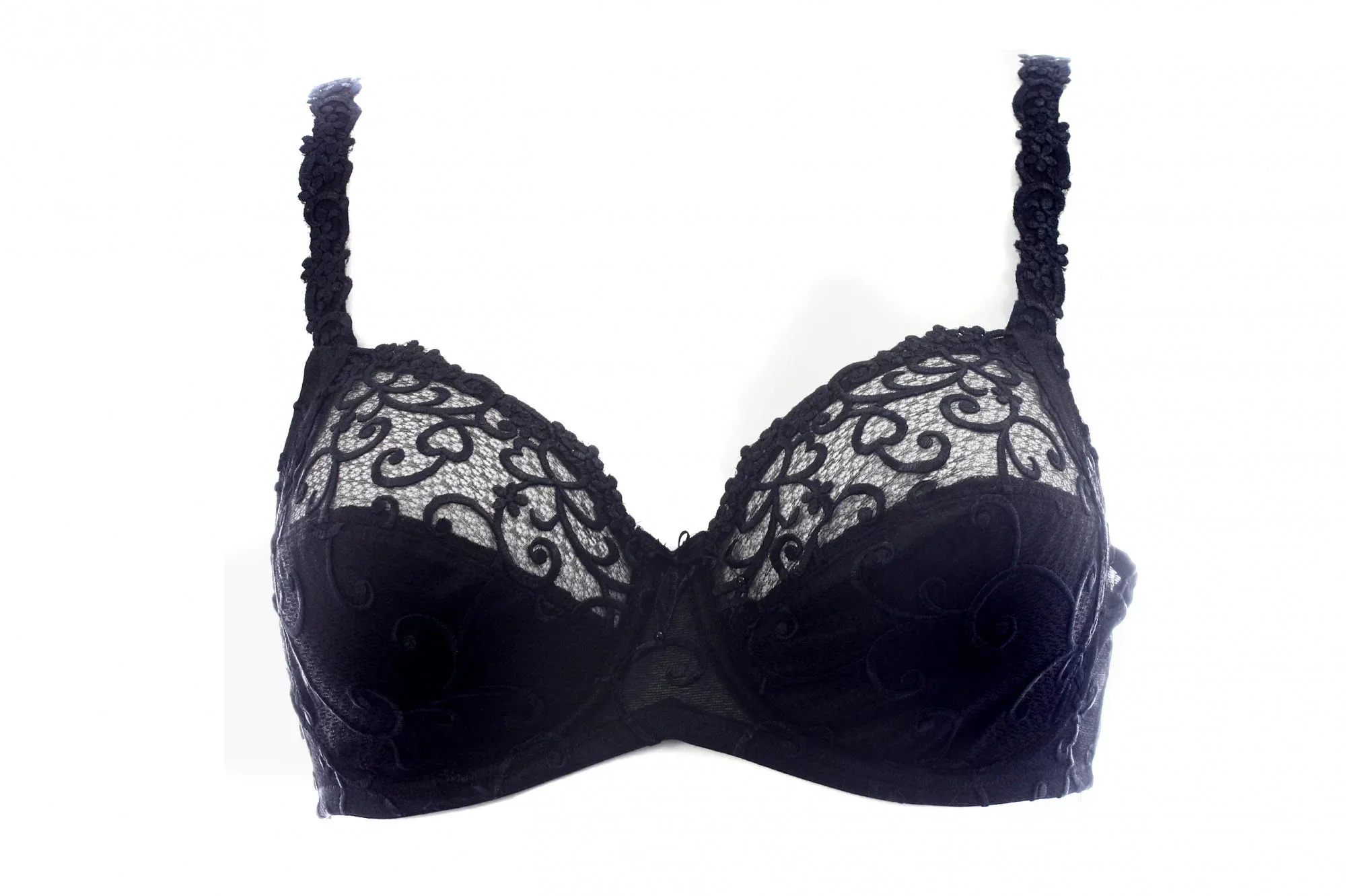 Podprsenka s kosticí perfektní výstřih propracovaná konstrukce u jednotlivých velikostí. Tato elegantní série zaujme na první pohled svou exkluzivní výšivkou na jemném podkladě. Ušlechtilé květinové ornamenty zdobí košíčky, ramínka a lemy podprsenek. Saténové mašličky s perličkami v dekoltu nebo na kalhotkách jsou dalšími krásnými detaily. Hebce podložená a nastavitelná ramínka nabízejí vysoký komfort nošení.