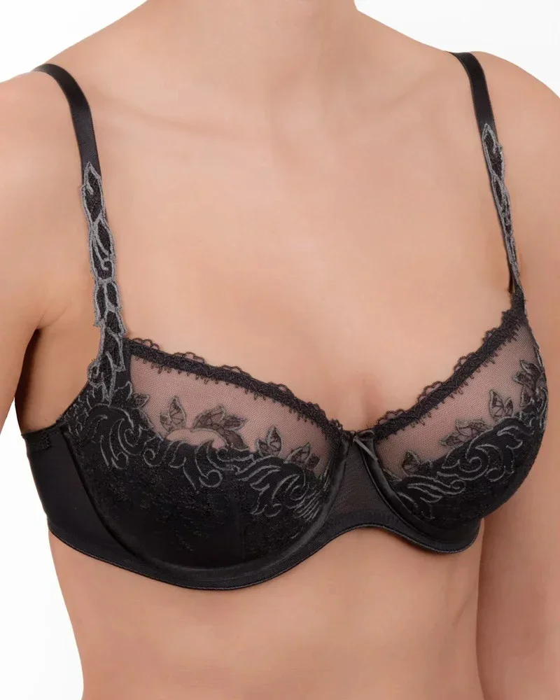 Luxusní balkónová podprsenka z řady Conturelle Poetry - s jemnou spodní výztuží. Svůdné výšivky ze Švýcarska. Poskytuje bezkonkurenční komfort. Ramínka zdobená vyšívanými motivy.