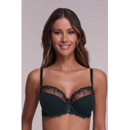 Biustonosz AV 1030 w nowej odsłonie kolorystycznej zachwyca elegancją i funkcjonalnością. Nietuzinkowy odcień benzynowej zieleni przyciąga wzrok, a sprawdzona konstrukcja K-1030 semi soft gwarantuje perfekcyjne dopasowanie do każdego typu biustu. Dolna część miseczek wykonana z miękkiej pianki pokrytej elastyczną dzianiną zapewnia stabilność i komfort noszenia, natomiast górna – zdobiona subtelnym haftem na tiulu – dodaje lekkości i kobiecego uroku.