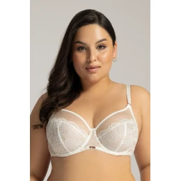 Górna część miski wykonana z tiulu wykończonego taśmą, dolna z koronki zdobionej haftem wykonanym złotą nitką. Miseczki głebsze, pełne, doskonale dopasują się do biustu.