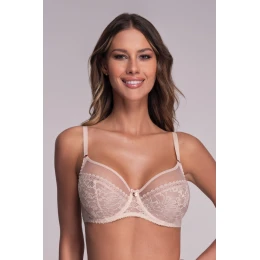 Beżowy biustonosz AV 1396 to doskonała propozycja dla kobiet szukających uniwersalnej, komfortowej i jednocześnie zmysłowej bielizny. Wykonany z transparentnej siateczki i subtelnej koronki, harmonijnie łączy elegancję z codzienną funkcjonalnością. Miękka konstrukcja z pełniejszą miską idealnie sprawdza się przy większym biuście – zapewnia naturalne ułożenie piersi i komfort bez dodatkowego usztywnienia. Model wyposażony jest w fiszbiny, które dobrze stabilizują biust i podtrzymują go przez cały dzień. Charakterystyczne detale – złoty element biżuteryjny na mostku i dekoracyjny paseczek nad miseczkami – dodają całości lekkości i stylu. Tył z gładkiego tiulu, zapięcie na haftki oraz regulowane ramiączka gwarantują wygodne dopasowanie. Kolor nude sprawia, że stanik jest niewidoczny pod jasnymi ubraniami.