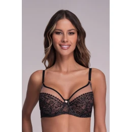 Biustonosz AV 1396 w kolorze czarnym to zmysłowy i elegancki model, zaprojektowany z myślą o kobietach, które potrzebują nie tylko piękna, ale i wygody na co dzień. Wykonany z transparentnej siateczki oraz wyrafinowanej koronki w kwiatowy wzór, pięknie podkreśla biust i dekolt. Model posiada pełniejszą miskę o miękkiej konstrukcji, która doskonale dopasowuje się do kształtu piersi, zapewniając naturalny wygląd i odpowiednie wsparcie – również dla większego biustu. Konstrukcja oparta na fiszbinach dobrze stabilizuje piersi, nie dodając objętości. Uwagę przyciągają ozdobne paski nad miseczkami i złoty detal biżuteryjny na mostku, które nadają całości nowoczesnego i kobiecego charakteru. Tył z gładkiego tiulu, z klasycznym zapięciem na haftki, oraz regulowane ramiączka gwarantują idealne dopasowanie. AV 1396 to biustonosz, który łączy lekkość, komfort i stylową elegancję &nd
