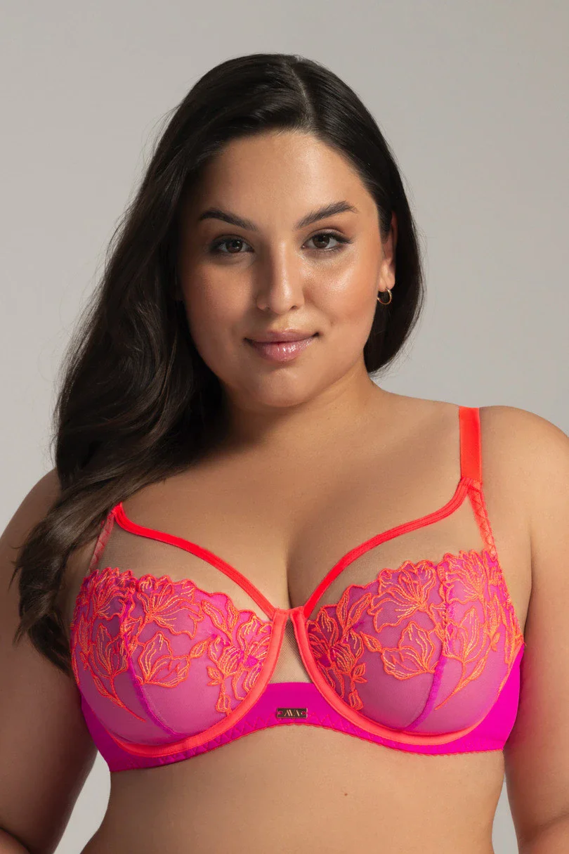 AV 2162 Flamingo Soft - neonový hit, který nikdy nevyjde z módy! Výrazná růžová barva tohoto modelu vás jistě chytne za srdce. Měkké košíčky se dokonale přizpůsobí vašim prsům a zároveň jim poskytnou pevnou oporu a krásně vynikne váš dekolt. Květinová výšivka v intenzivních barvách se táhne po prsou a dodává celku jemnou smyslnost. Oranžové lemování, tunýlky a ramínka v kombinaci s fuchsiovým obvodem podtrhují koketní charakter podprsenky a zajišťují pohodlné nošení. Koketní průsvitnost v horní části košíčků a umně navržené kalhotky a nohavičky lákají vaši fantazii. Odvažte se být barevnou extravagancí!