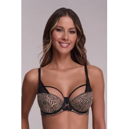Biustonosz AV 2192 Rebel Tiger Semi Soft marki AVA to wyjątkowe połączenie drapieżności i kobiecej elegancji. Półusztywniane miseczki typu semi soft doskonale kształtują biust, unosząc go i stabilnie podtrzymując. Elastyczna dzianina w zwierzęcy print nadaje charakteru, a zestawienie cielistego i czarnego tiulu tworzy efektowny kontrast, który pięknie podkreśla kształty.