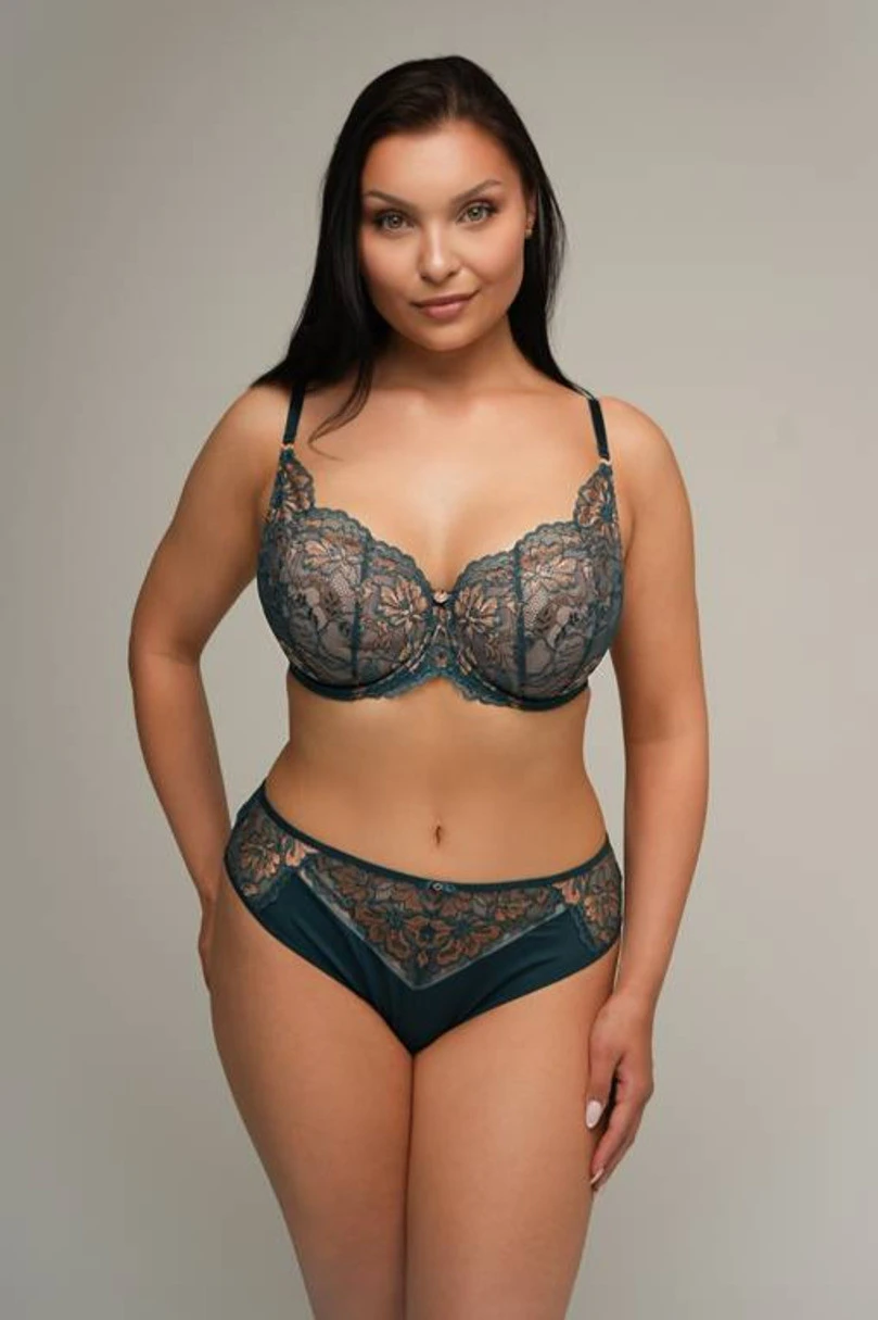 Odkryj wyjątkowy komfort i elegancję z naszym koronkowym biustonoszem push-up, który doskonale podkreśla kobiece kształty. Ten zmysłowy model został wyposażony w wyjmowane wkładki, co pozwala na indywidualne dopasowanie poziomu uniesienia biustu. Dzięki pionowym cięciom miseczek biust jest efektownie uniesiony i zaokrąglony, a całość prezentuje się niezwykle kobieco i stylowo. Delikatna koronka z kwiatowym wzorem w kolorze starego złota nadaje bieliźnie luksusowego charakteru, a głęboki odcień zieleni dodaje elegancji.