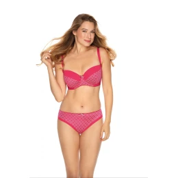Krásná, ženská, intenzivně růžová, vyztužená podprsenka s plnými košíčky. Model, který dobře sbírá, tvaruje a zvedá prsa a vytváří svůdný dekolt. Vrchní část je hladce zakončená, spodní část s jasným, květinovým potiskem. Vysoký střed poskytuje dobrou oporu poprsí. Košíčky jsou plně vyztužené, obvod je měkký a dobře přilne k tělu. Složení: 43 % polyamid, 30 % polyester, 16 % bavlna, 7 % elastan, 4 % polyuretan.