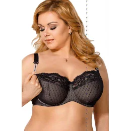 Měkká podprsenka s kosticemi pro kojící ženy.Košíčky modelu jsou vyrobené z černé puntíkované síťoviny a jsou podšité jemnou bavlnou. Horní linii zdobí efektní černá krajka. Ramínka mají zapínání typu Quick Clic. Díky tomu je možné odepnout a zapnout jednou rukou, což usnadňuje kojení dítěte.