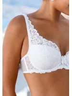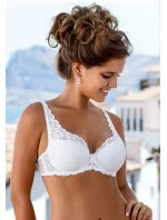 Elegantní krajková podprsenka v bílé barvě, která z Vás udělá jemnou romantickou ženu. Košíčky jsou vyztuženy a mají kostice pro lepší podporu Vašeho poprsí. Krajka je jemná, elastická a plynule přechází do ramínek, která jsou pevně všita s nastavitelnou délkou. Krajka přesahuje vrchní okraj košíčků a jemně i spodní okraj poprsenky. Vyšší střed je ozdoben látkovou mašličkou. Obvod podprsenky je zpevněn bočními kosticemi a krajka přechází do tylu. Zapínání je na tři pozice a dva háčky.