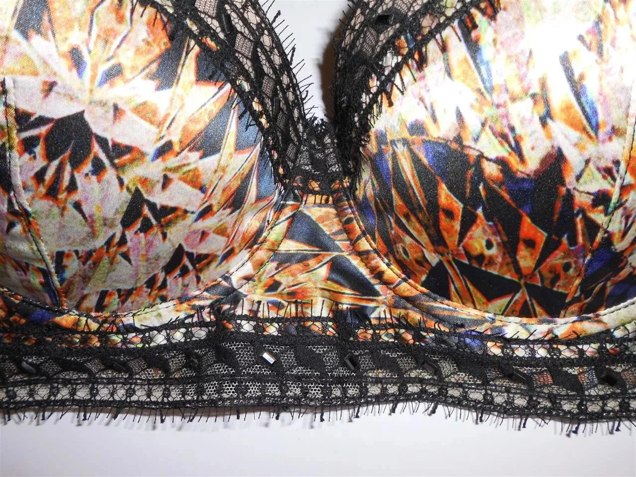 Luxusní podprsenka Pleasure State P23 - 1212C, pestrobarevný hladký materiál kombinovaný černou krajkou, zapínání na 3 háčky. Složení: 92% polyester, 8% elastan.